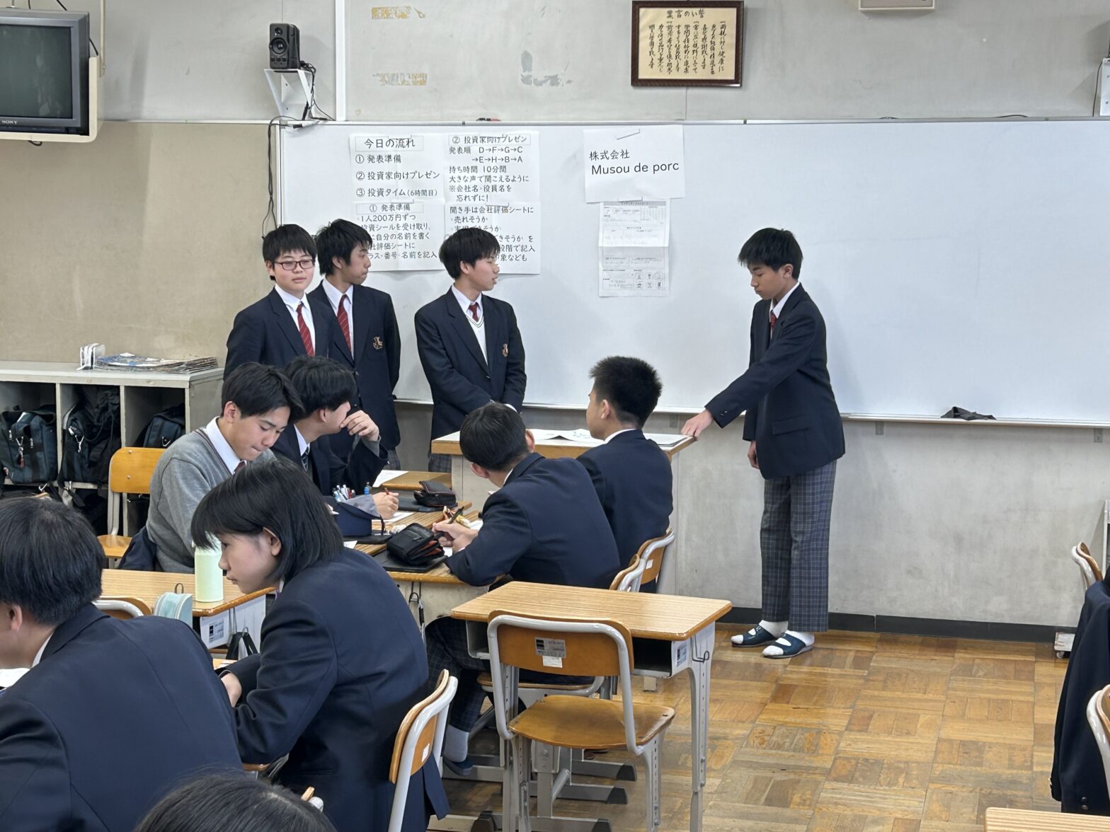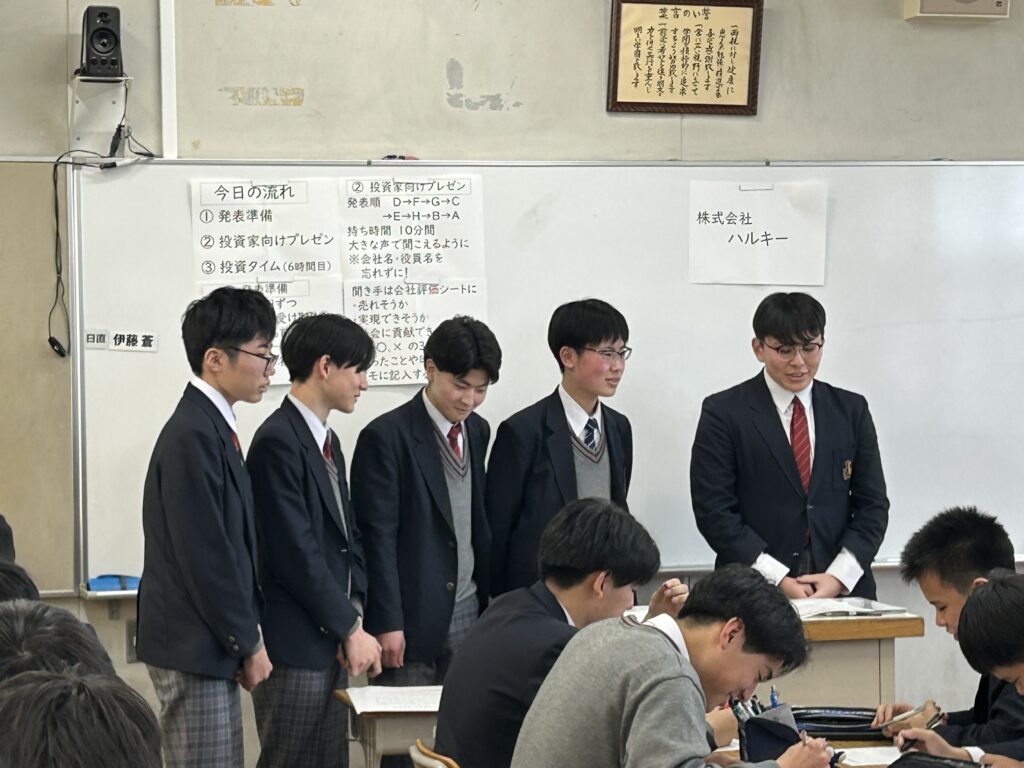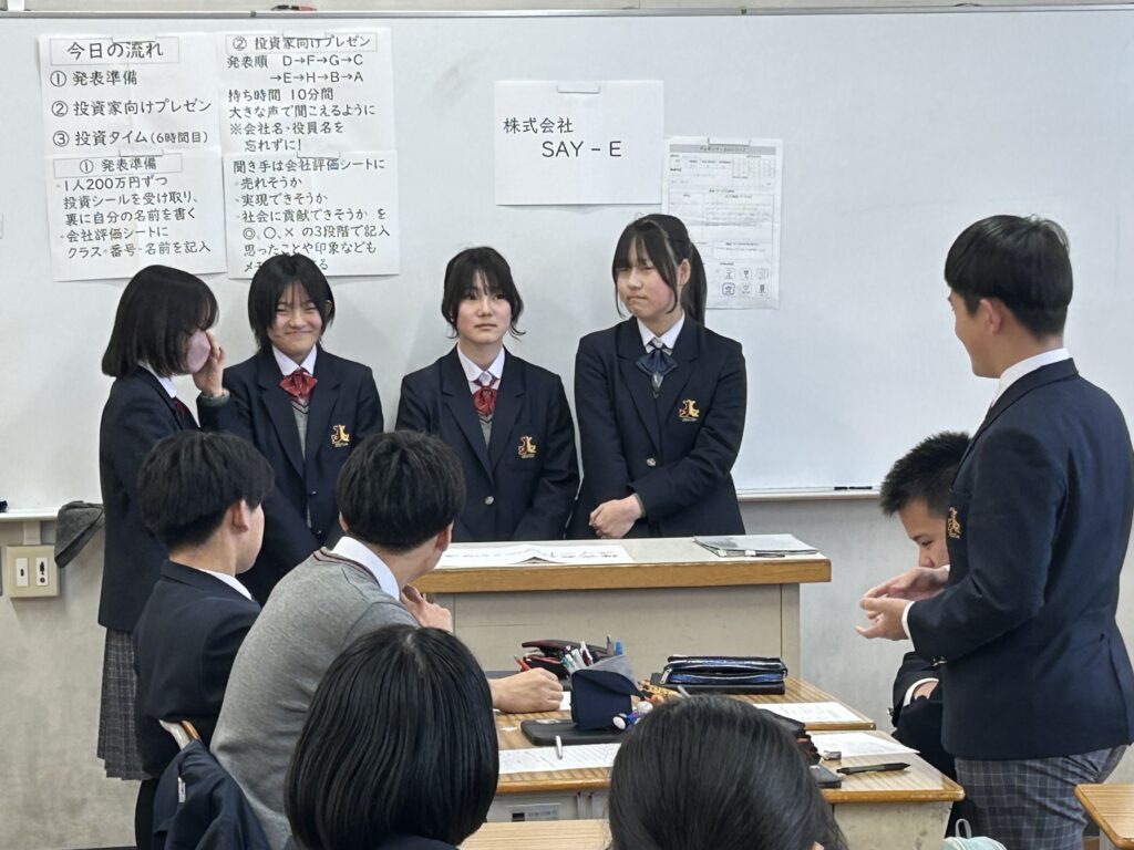 「わが社に投資してください」――社会の時間、3年生が「株式会社」づくりにチャレンジしました。各グループが自社のよさをプレゼンで紹介。それを聞いた投資家(生徒や教員)は、投資する会社と投資金額を決めて、それぞれの事業内容を評価していました。どの会社も投資家の支援を受けようと、自社の事業内容をふんだんにアピール。投資家からはその内容について多くの質問が寄せられました。今日の起業家の中から、未来の起業家が誕生するかもしれませんね。