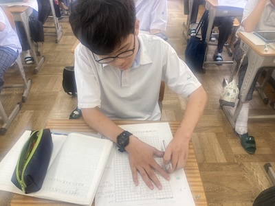 まず、自分の体重(kg)を(N)に換算します。そして、自分の足の裏の面積を求めます。不規則な形をしているので、足の裏の面積を求める公式はありません。そこで、方眼用紙をつかって、何マス分あるかを数えて、足の裏の面積を求めました。
